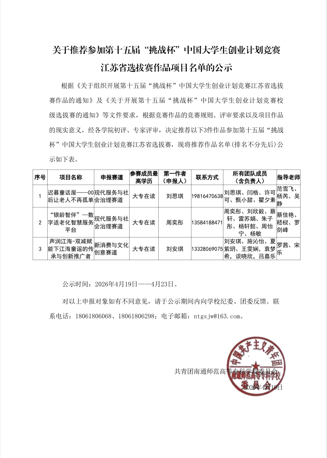 关于推荐参加第十五届“挑战杯”中国大学生创业计划竞赛江苏省选拔赛作品项目名单的公示